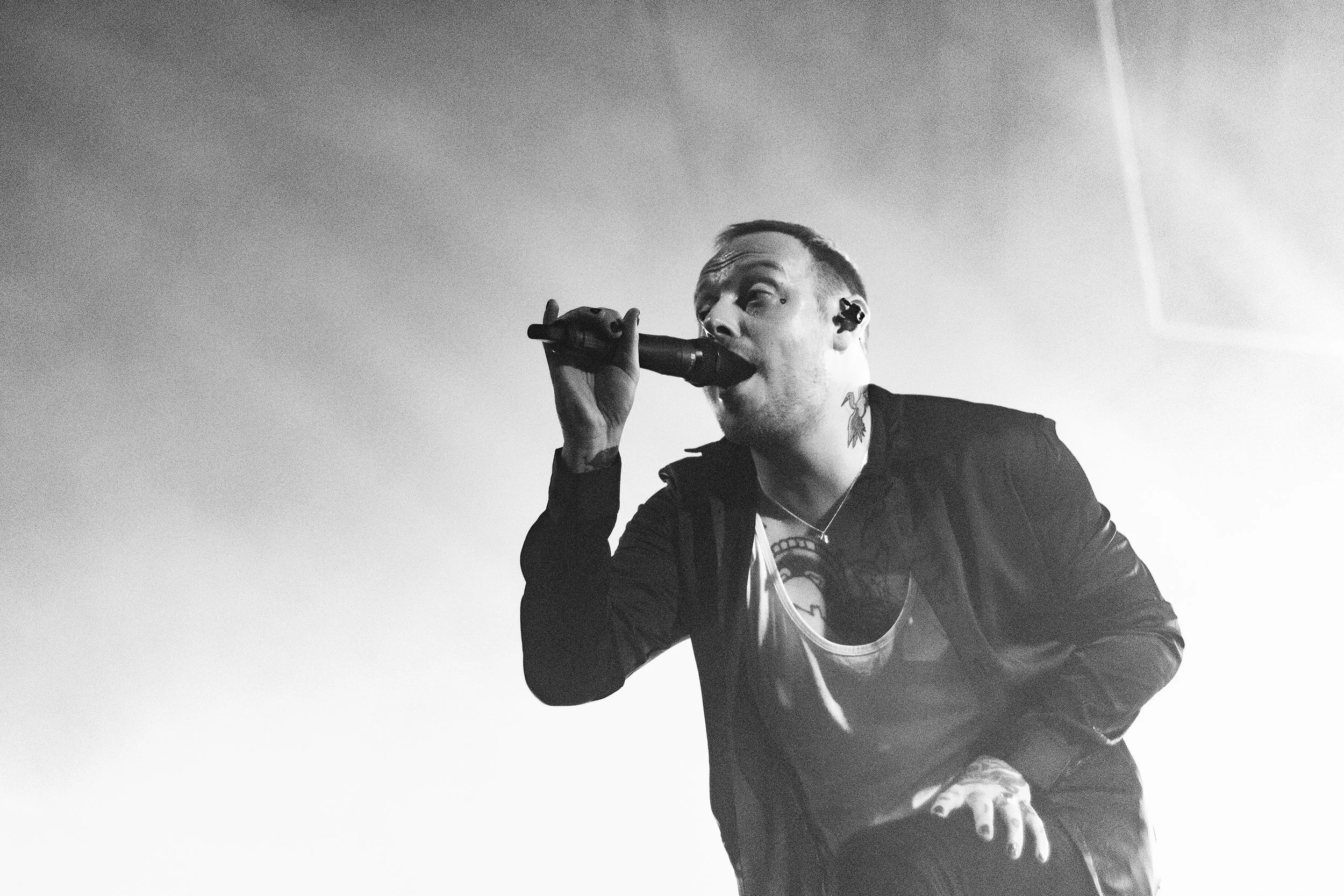 At this point, it was time to bring it down a little with the emotional (if sinister) Mine, complete with blasts of blinding lights and a choral contingent residing behind, with some entrancing falsetto for good measure, and the slightly strange choice of Like That. Not a bad one, for sure; some pounding drums and a catchy chorus often forgive pretty much anything. But an interesting one given the limited set and the Architects crowd residing in front. The husky questioning emerging from the stage — ‘do you like that’ — was met with an enthusiastic, if not perhaps resounding, yes.