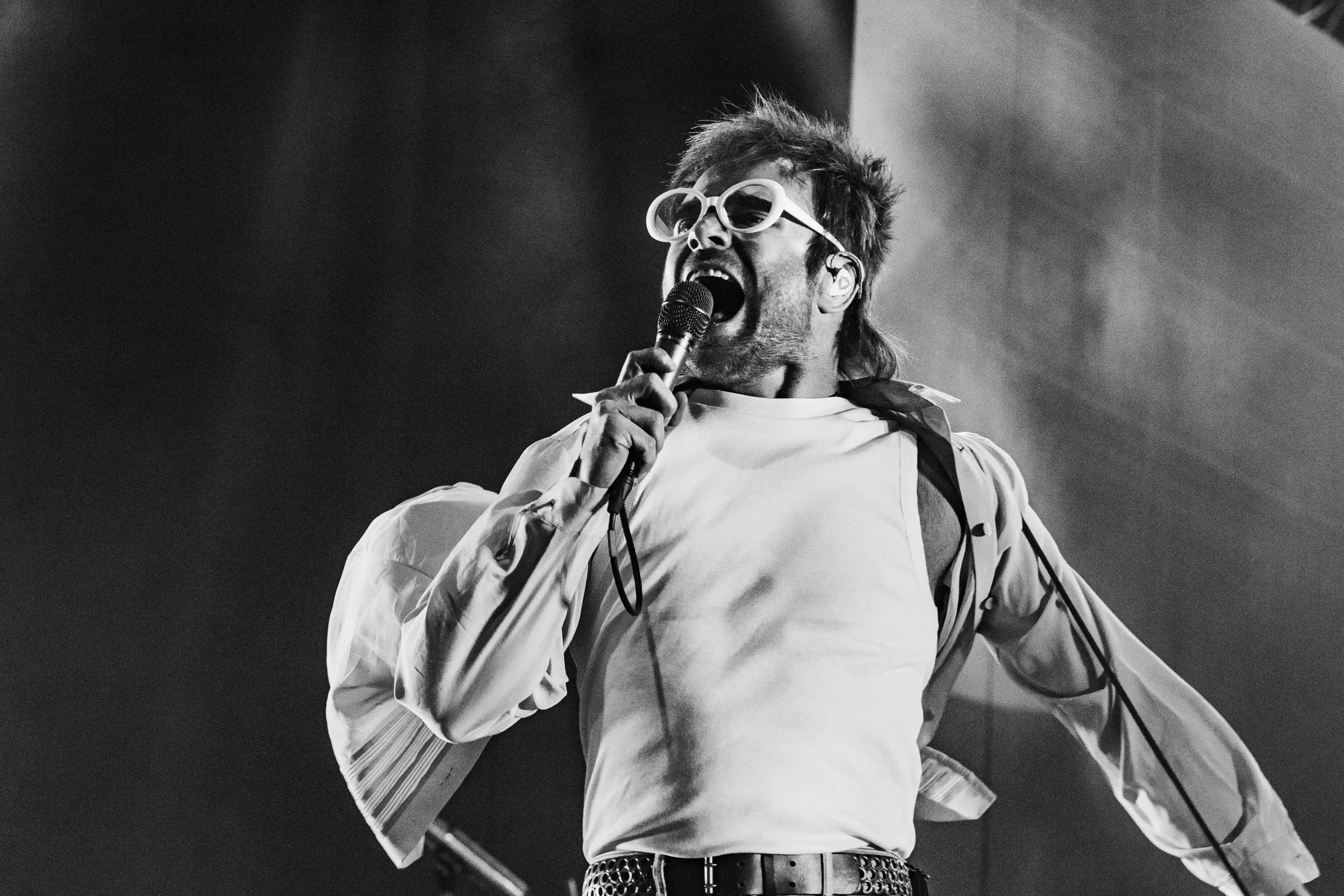 ‘Bloodshot’, arguably the fan favourite of the four singles released for ‘A Kiss For The Whole World’, was something else. You would be hard pressed to forget the three~ minute performance piece preceding it — Rou Reynolds delving in one of the light boxes before ripping it out, as if stung, with a holographic copy of his hand following suit, before falling in, drowning, writhing, gasping for air and hammering for escape, was at worst unexpected and at best mesmerising — or the unsettling, hypnotically swaying watches on the back wall; all this before the song even started, which itself saw blinding lasers firing across the crowd and streaks of lightning scarring the backdrop. It was phenomenal.